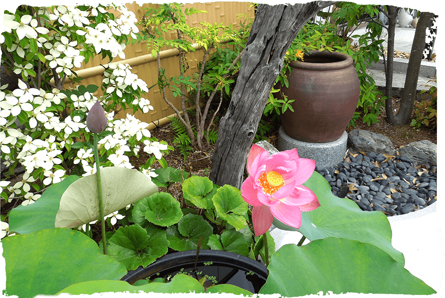 ひしゃくの水を砂利にかけてみてください。しずくの音色に非日常を感じられます。